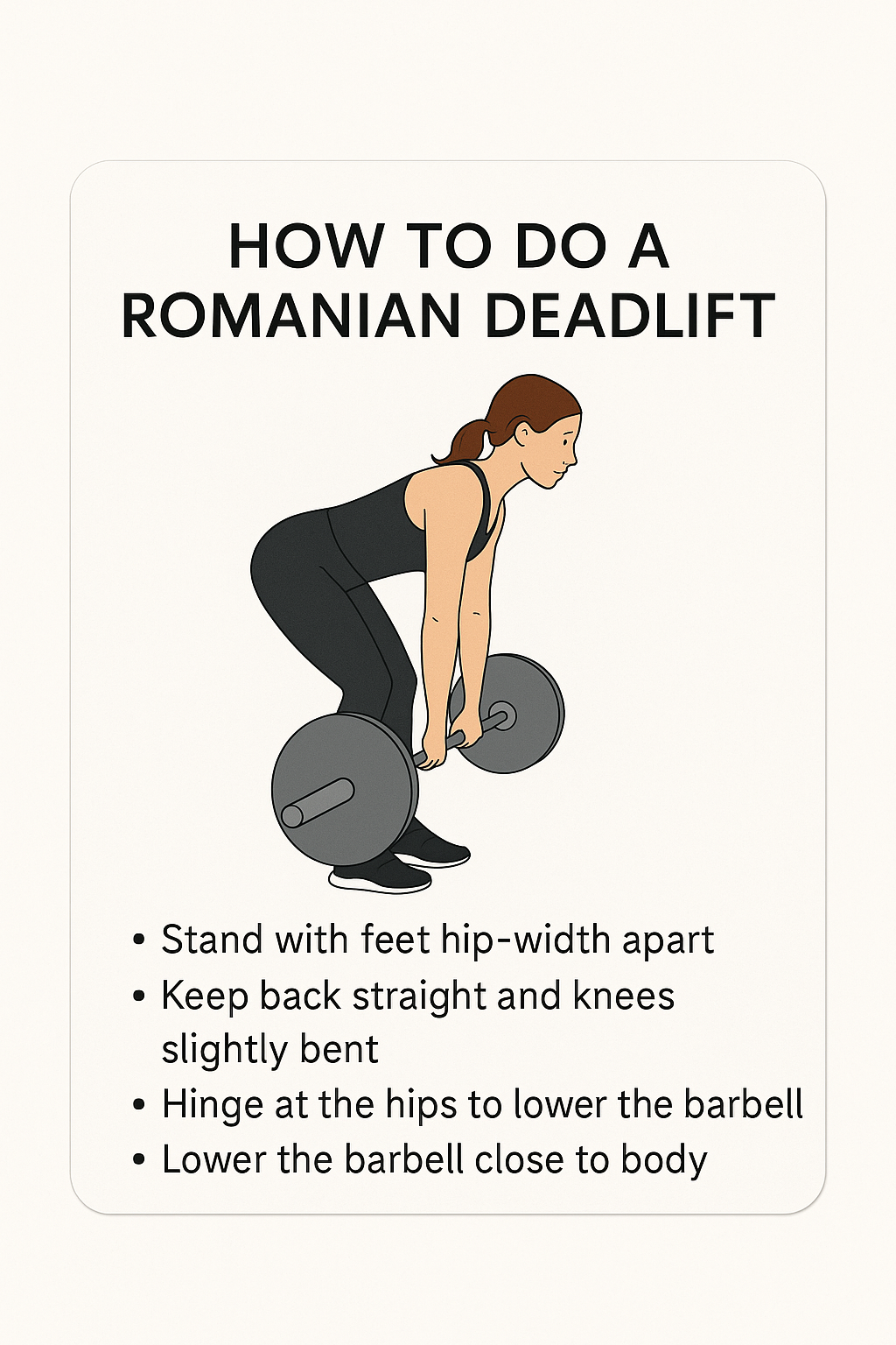 Romanian deadlifts are excellent for strengthening the hamstrings, glutes, and lower back. They improve posterior chain strength, hip hinge mechanics, balance, and flexibility while reducing the risk of injury. This exercise is particularly effective for building hamstring strength without overloading the lower back.