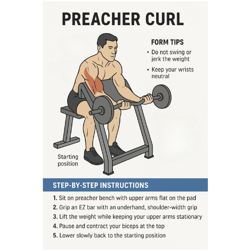 Sit on a preacher bench with your chest against the pad and feet flat on the floor. Place the backs of your upper arms flat on the preacher pad.
